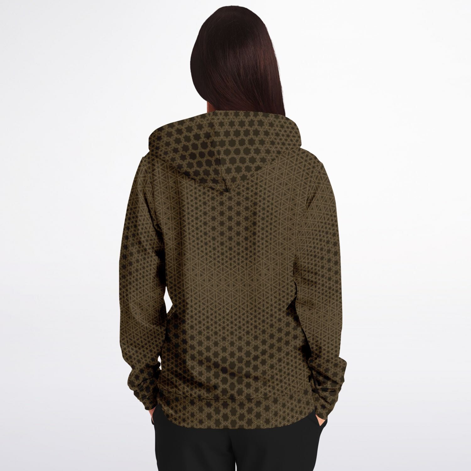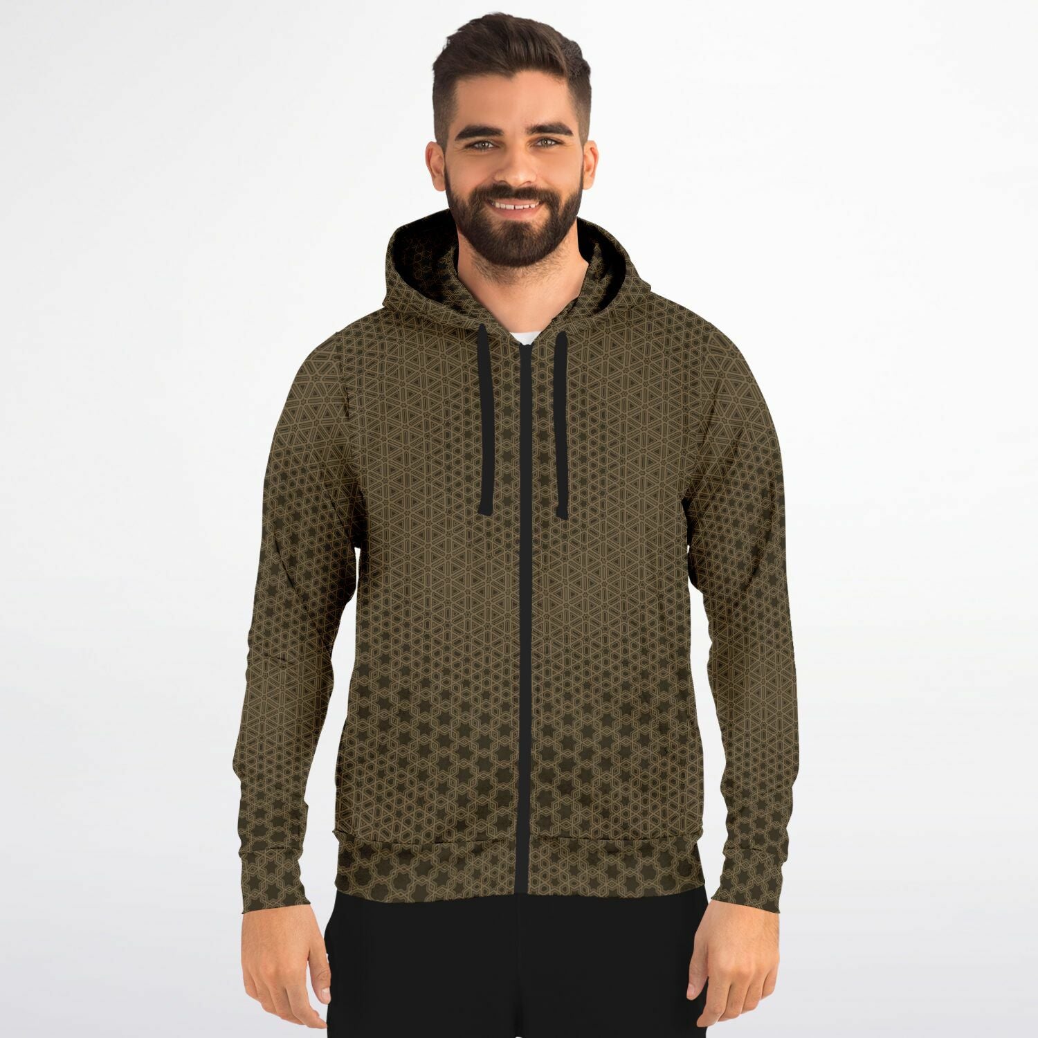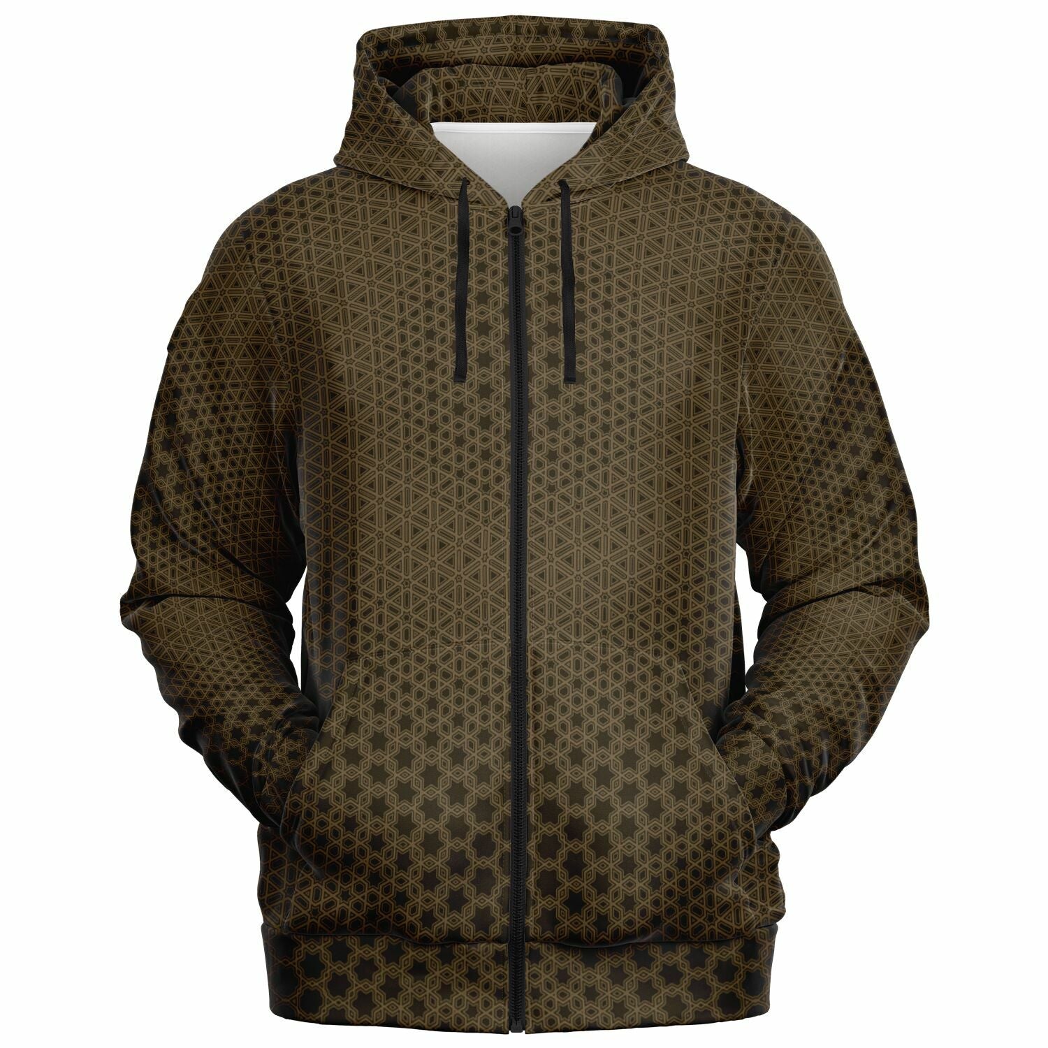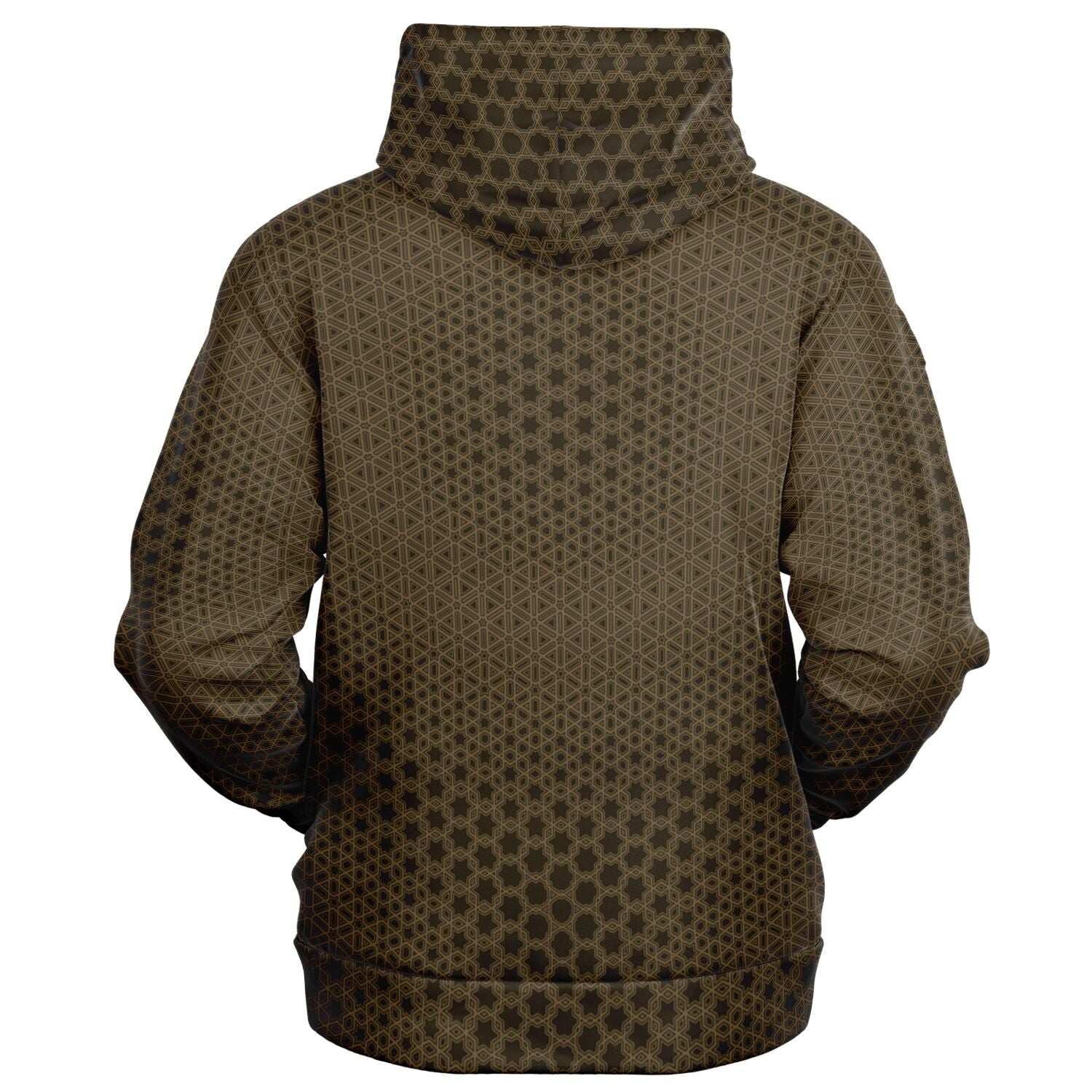 Each panel is individually printed, cut, and sewn so the geometry flows cleanly across the garment with no breaks or distortions. Soft microfleece lining on the inside makes this easy to throw on, whether you are dancing, travelling, or exploring expanded perception.